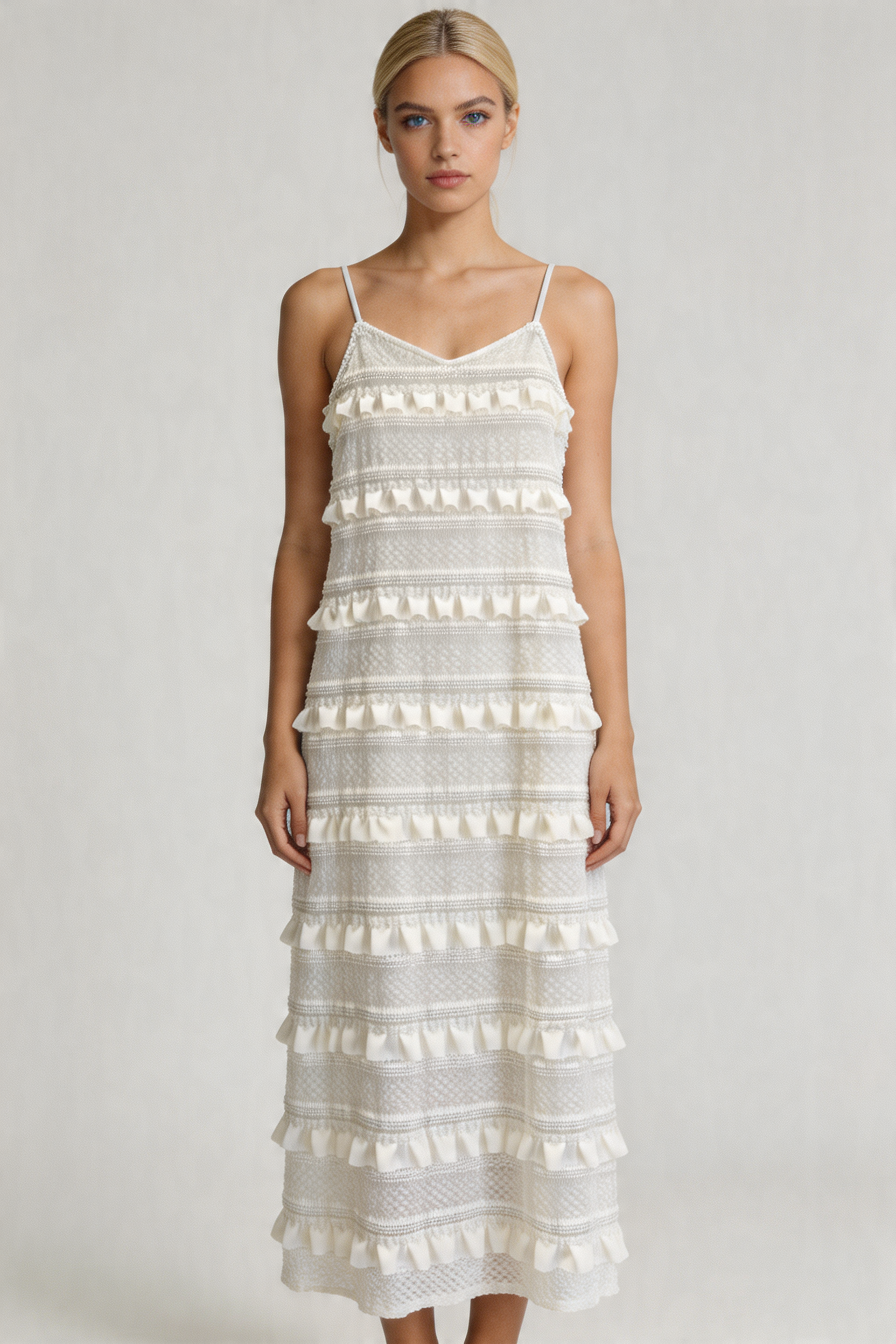 Intricate Tiered Textures: Designed with a stunning visual mix of sheer geometric lace paneling and horizontal rows of delicate pleated ruffle trims that cascade gracefully down the entire length of the dress.