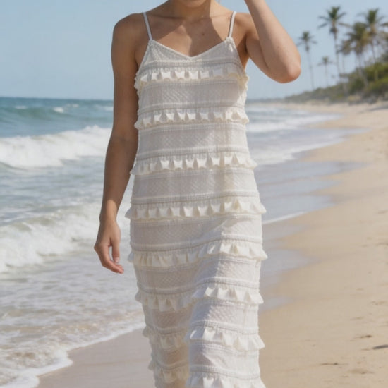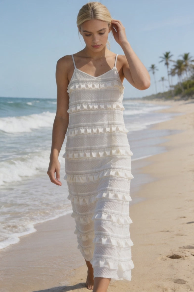 Ethereal Bohemian Elegance: This beautiful slip-style maxi dress offers a romantic, vintage-inspired aesthetic, crafted in a soft ivory hue perfect for warm-weather events, bridal showers, or resort wear.