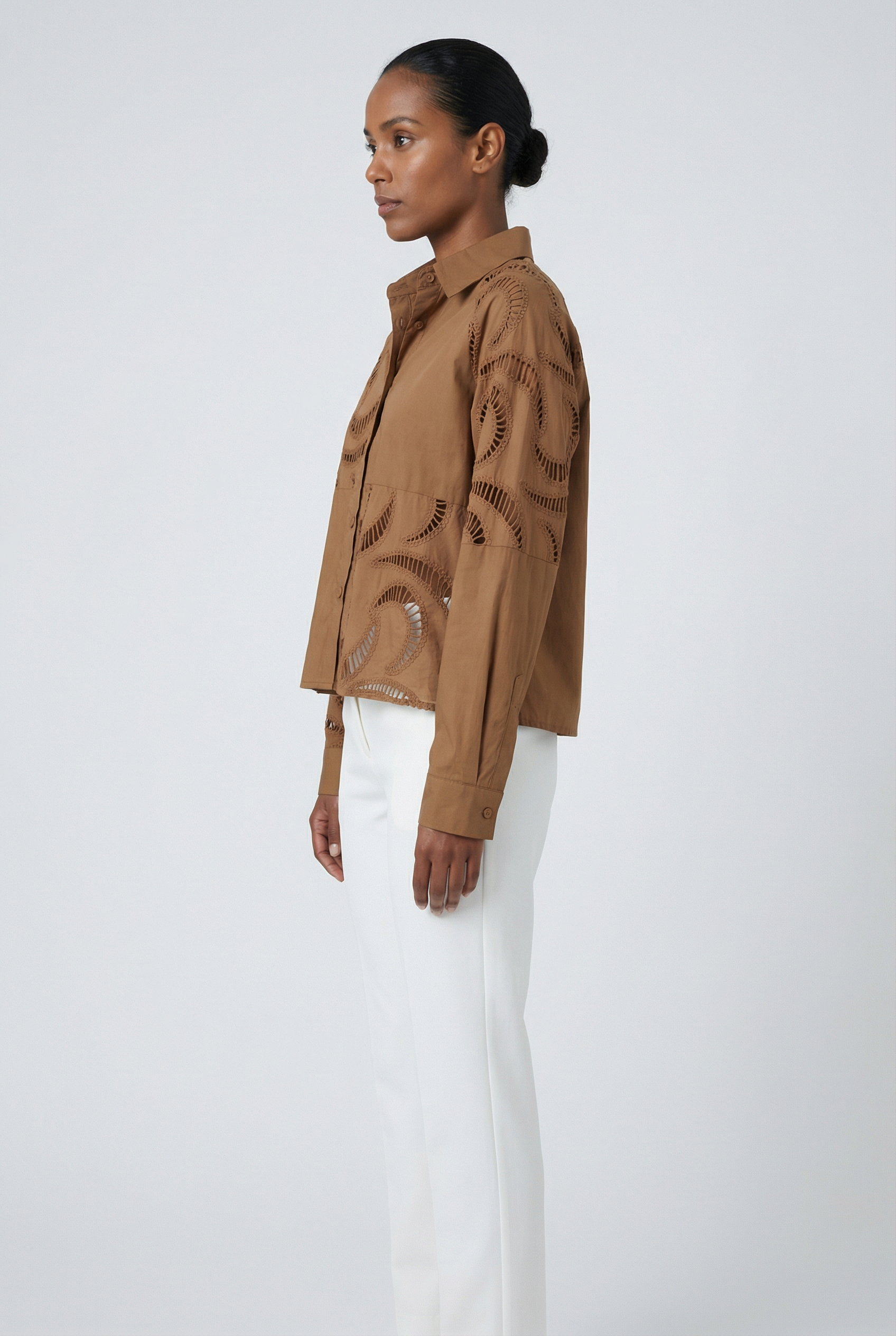 • Modern Broderie Design: This stunning shirt reinvents classic eyelet with large-scale, abstract swirl cutouts and intricate embroidery, creating a bold, architectural look.