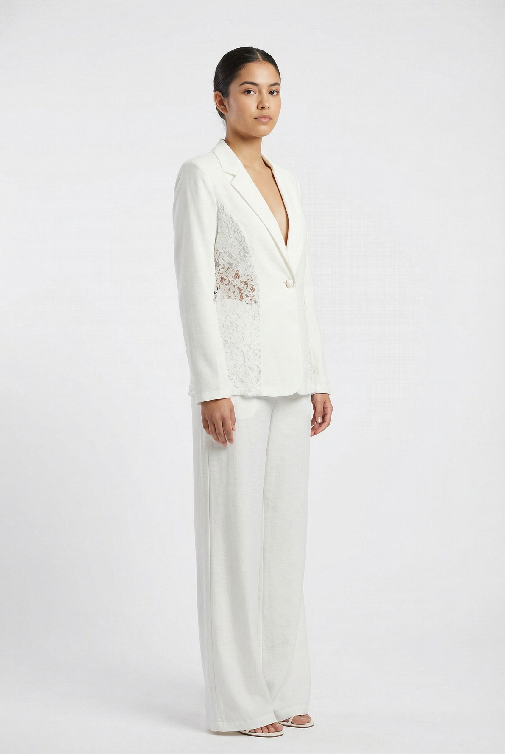 • Romantic Lace Detail: This sophisticated two-piece set reinvents the classic white suit with intricate floral lace inserts along the sides of the blazer, adding a delicate, feminine touch.
