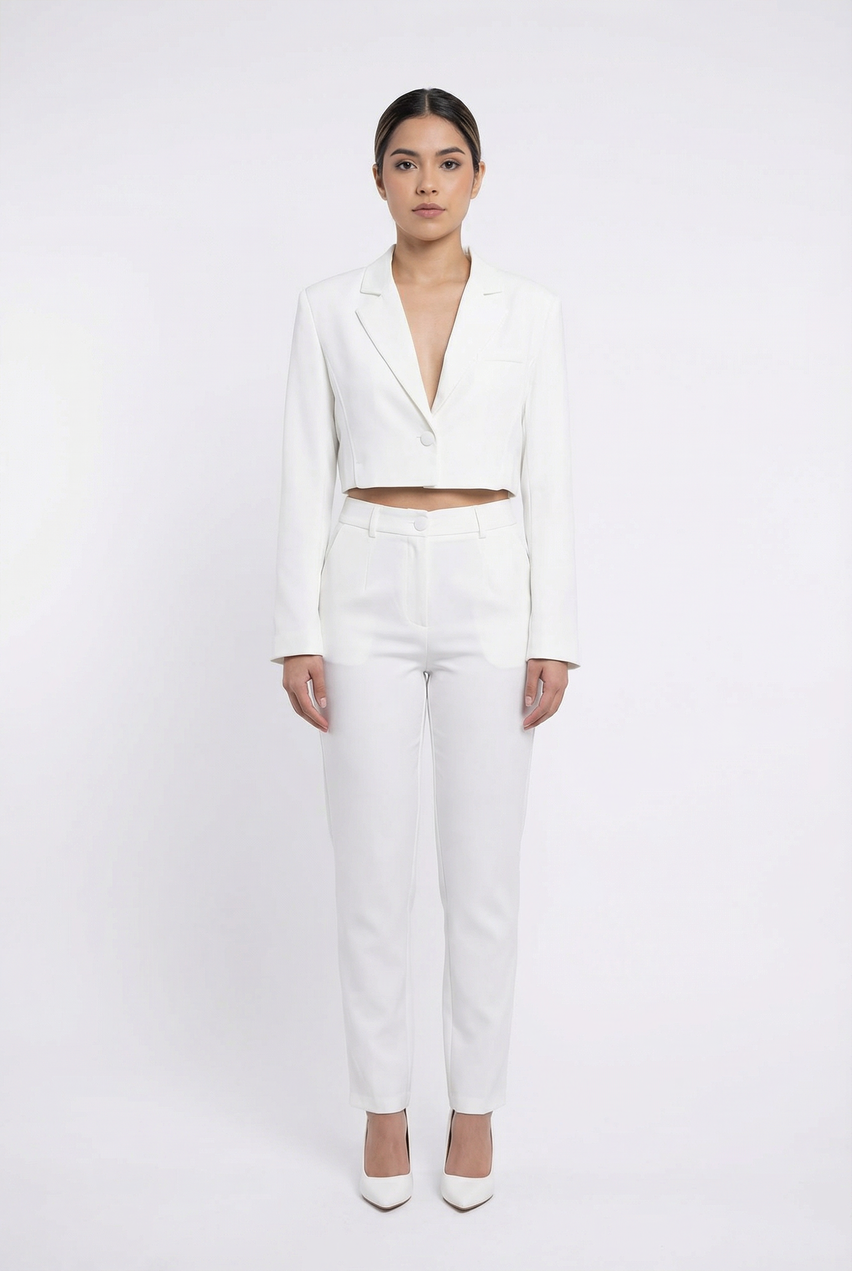 • Modern Cropped Silhouette: This blazer features a trend-right cropped length that sits perfectly at the waist, making it the ideal companion for high-waisted trousers and skirts.