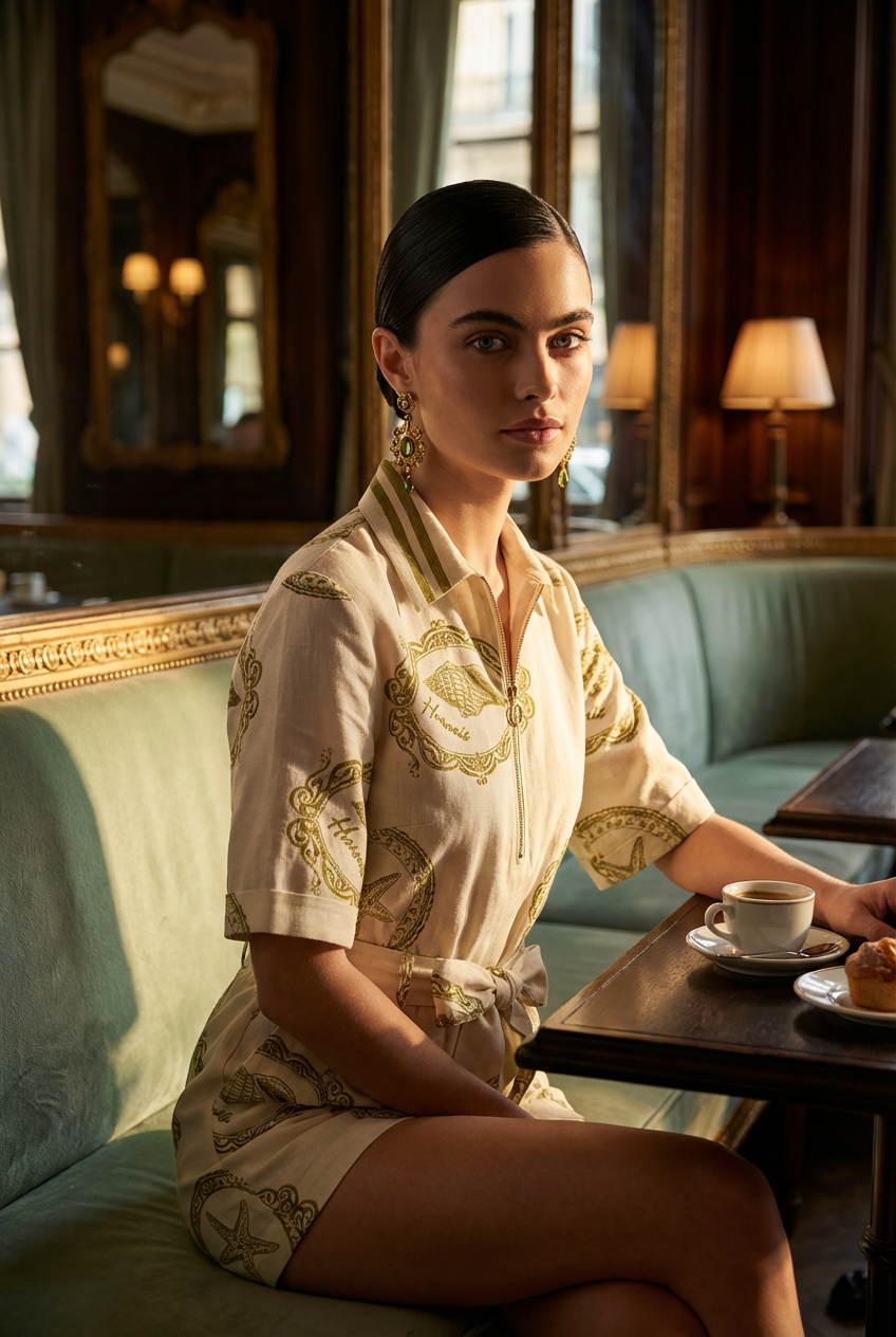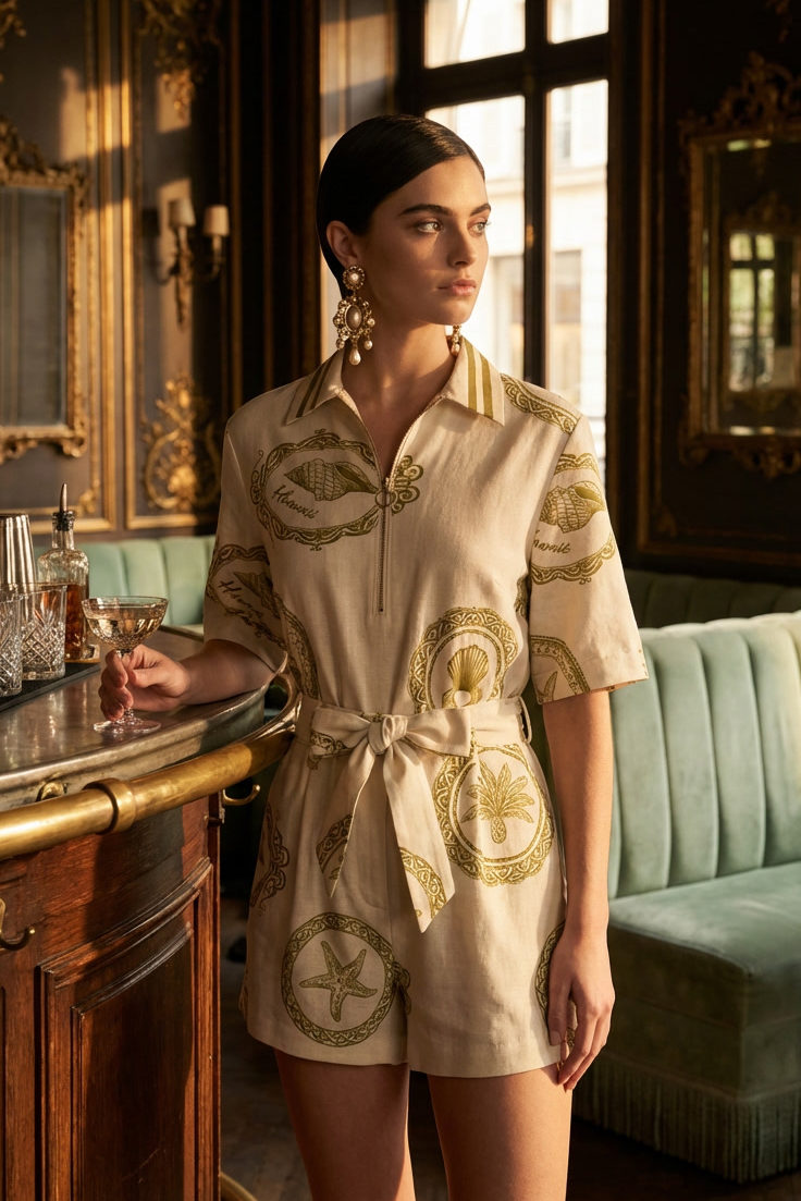 Retro Resort Charm: This delightful two-piece short set features a vintage-inspired tropical novelty print showcasing beautifully framed coastal motifs like starfish, seashells, palm trees, and elegant script against a crisp ivory base.