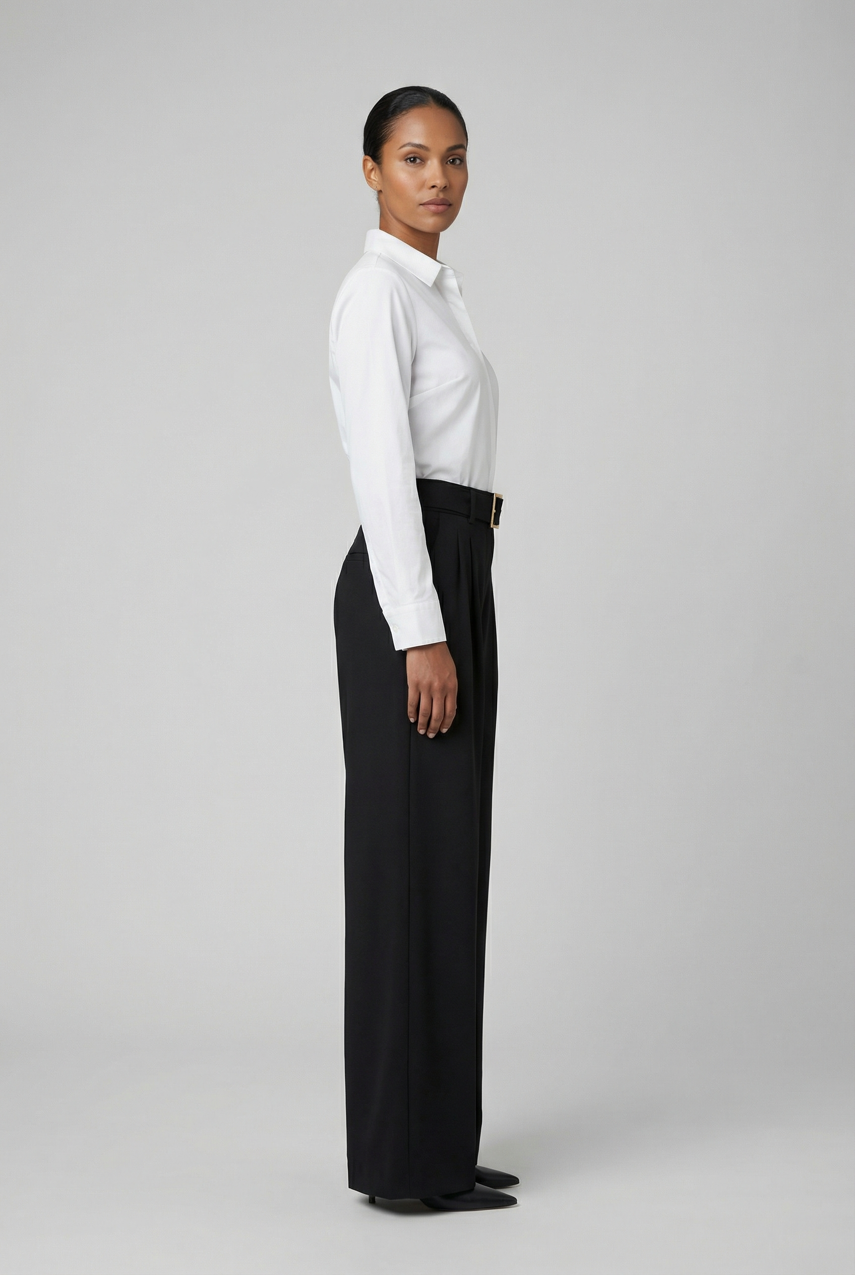 • Sophisticated Silhouette: These trousers feature a high-waisted design with a flowing wide-leg cut, creating an elongated and elegant profile suitable for any professional or social setting.